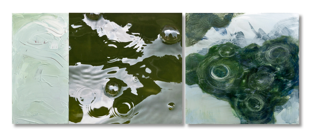 Seit einiger Zeit nutzt Gisela Happe ihre ursprünglich als Skizzen angefertigten Natur-Fotografien, um sie als gleichwertige Partner mit ihrer Malerei korrespondieren zu lassen - und einen Dialog zu entfachen, der auf den Betrachter überspringt. Gegenständliche Fotografie und abstrakte Malerei stehen nebeneinander und bilden dennoch eine Einheit. Das Thema der Fotografie kreist vornehmlich um das Element Wasser in all seine Facetten. Die Transparenz des Mediums Acrylglas unterstreicht die Darstellung des Motivs und erzeugt eine fast realitätsnahe Wiedergabe des Wassers. Die Malerei nimmt diese Wirkung auf und die häufig lasierend aufgetragenen Farben scheinen durch und mischen sich durch die aufgetragenen Schichten. Ein Prozess, der zwar gelenkt, bei dem aber das Unvorhergesehene willkommen ist. Hinzu kommt das Licht, das durch die Acrylglasscheibe gefangen und wieder ausgestrahlt wird, so dass ein irisierender Effekt eintritt, der die Leuchtkraft der Farben intensiviert und eine hohe Luminanz erzeugt. Da sich beide Medien auf Acrylglas als Trägermaterial manifestieren, fügen sie sich in besonderer Weise sowohl inhaltlich als auch formal zu einer starken, miteinander korrespondierenden Einheit zusammen. Diese Arbeiten bilden seit einiger Zeit eine ganz eigene intermediale Werkgruppe im künstlerischen Schaffen von Gisela Happe.